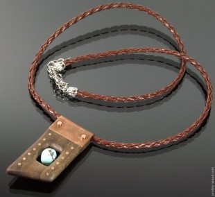 Материал основы — орех. Бусина из натуральной тянь-шаньской бирюзы. Инкрустация медью. Подвес – медь. Покрытие — пчелиный воск.