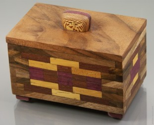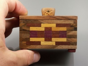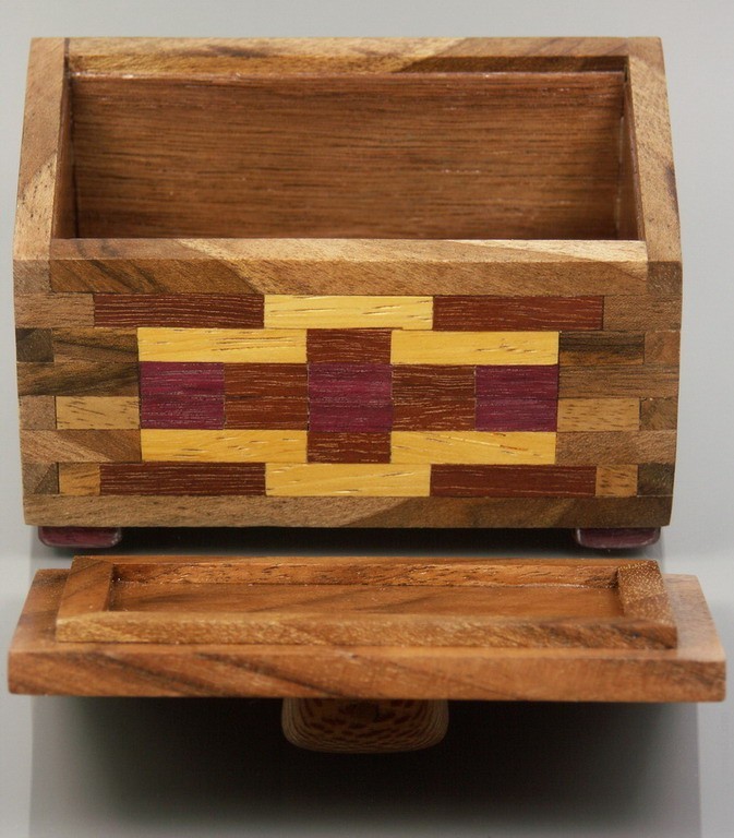 Собрана из мозаичных фрагментов древесины ореха, масарандубы, амаранта, ироко и платана. Крышка и дно – орех. Ножки – амарант. Ручка – платан и амарант, латунь. Изнутри отделана шпоном дуба и покрыта лаком. Покрытие – пчелиный воск.