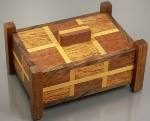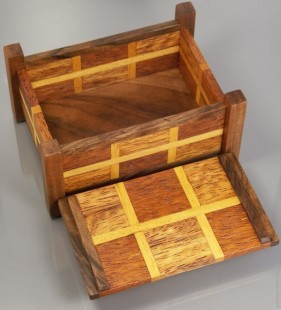Детали шахматного набора из древесины мербау светлого и темного оттенков. Светлые промежутки – ироко. Ножки, дно, детали каркаса – орех. Ручка – масарандуба и ироко. Размеры (Д х Ш х В): 100 х 80 х 50 мм. Покрытие – пчелиный воск.