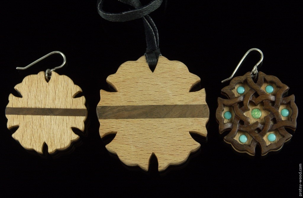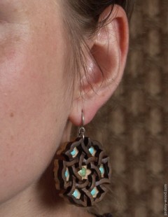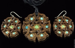 Основа – граб. Резная накладка – орех. Вставки – натуральная кызылкумская бирюза. Швензы – серебро. Покрытие – пчелиный воск. Размеры (диаметр): кулон – 50 мм, серьги – 35 мм. По мотивам традиционных арабских орнаментов – арабесок.