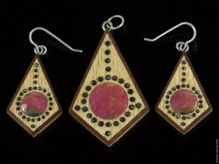 Основа – граб. Инкрустация – масарандубой. Центральные вставки – «пейзажный» родонит. Вставки по кругу из черного граната – меланита. Подвес и швензы – серебро.