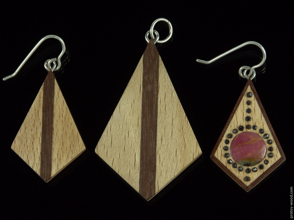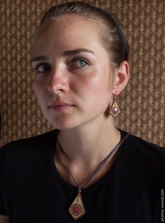Основа – граб. Инкрустация – масарандубой. Центральные вставки – «пейзажный» родонит. Вставки по кругу из черного граната – меланита. Подвес и швензы – серебро.