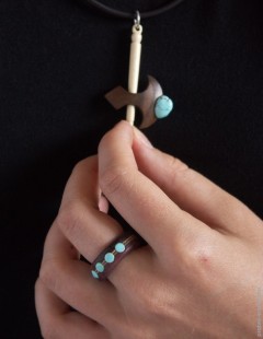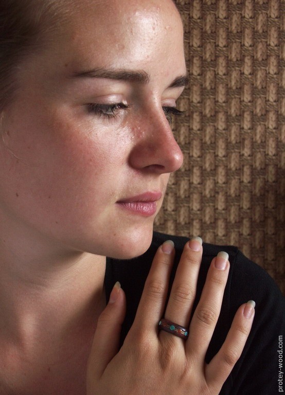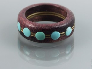 Кольцо вырезано из слоистого набора из двух слоев амаранта и между ними три слоя дубового шпона. Вставки из натуральной тянь-шаньской бирюзы. Покрытие – пчелиный воск. На одном из фото вариант кольца со вставками из натуральной бирюзы и коралла.