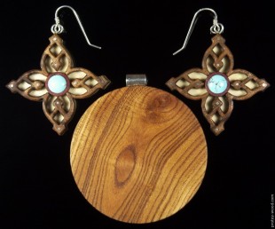 Основа кулона двухслойная. Из ореха и миндаля обыкновенного (тыл). Резные накладки – боярышник, клен Семенова, амарант. Вставки на кулоне – лазурит и малахит разных оттенков. На серьгах – натуральная тянь-шаньская бирюза. Точечная инкрустация, подвес и швензы – серебро.