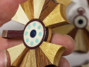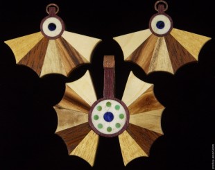 Боярышник, клен, яблоня, орех, мербау, сатиновое дерево, амарант. Инкрустация – кость, азурмалахит или бирюза. Подвес – медь.