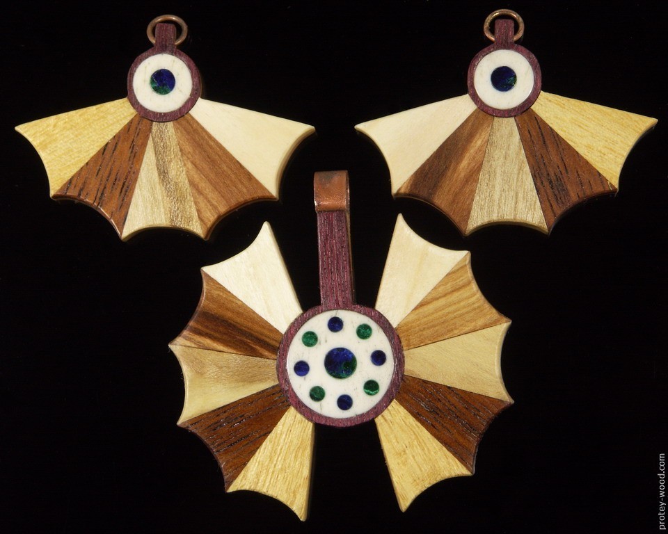 Основа – боярышник. Мозаичный набор (сверху вниз на кулоне, на серьгах аналогично) – клен Семенова, яблоня, клен туркестанский (серый), мербау, бразильское сатиновое дерево. В центре – амарант.