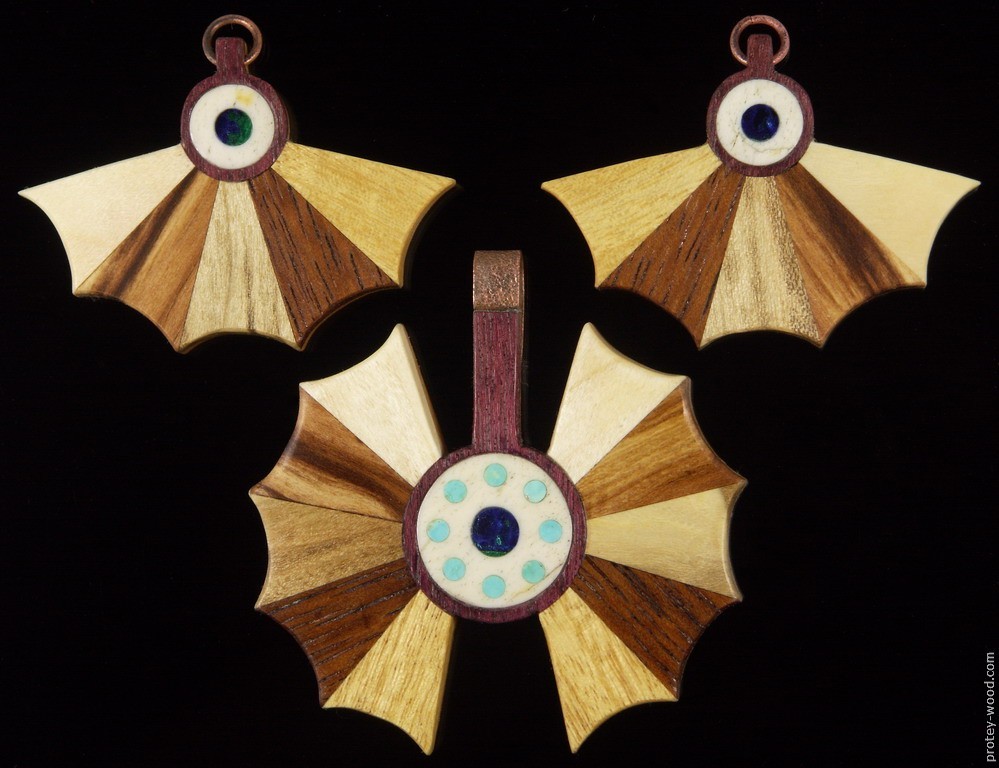 Боярышник, клен, яблоня, орех, мербау, сатиновое дерево, амарант. Инкрустация – кость, азурмалахит или бирюза. Подвес – медь.