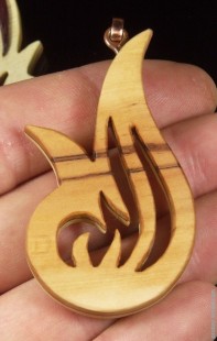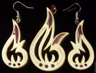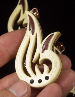 Трехслойная основа – клен Семенова, шпон дуба, боярышник (тыл). Резные накладки – амарант. Инкрустация медью и латунью. Вставки из натурального черного граната – меланита. Камни природной формы без огранки и обточки. Подвес – оксидированная медь.