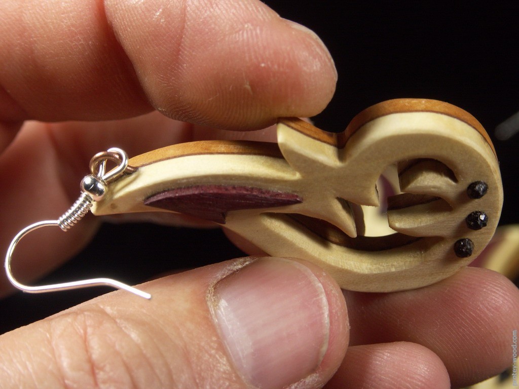 Трехслойная основа – клен Семенова, шпон дуба, боярышник (тыл). Резные накладки – амарант. Инкрустация медью и латунью. Вставки из натурального черного граната – меланита. Камни природной формы без огранки и обточки. Подвес – оксидированная медь.