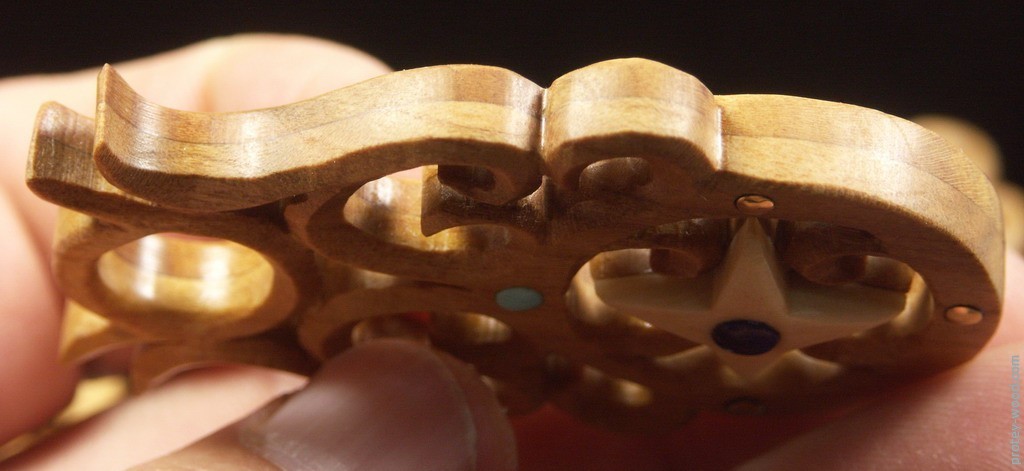 Основу составляет двухслойный набор из яблони. Накладки из клена Семенова. Вставки в центре из лазурита, на «севере» из натуральной тянь-шаньской бирюзы. Остальные – латунь в форме выпуклых кабошонов. Подвес на серьгах – медь.