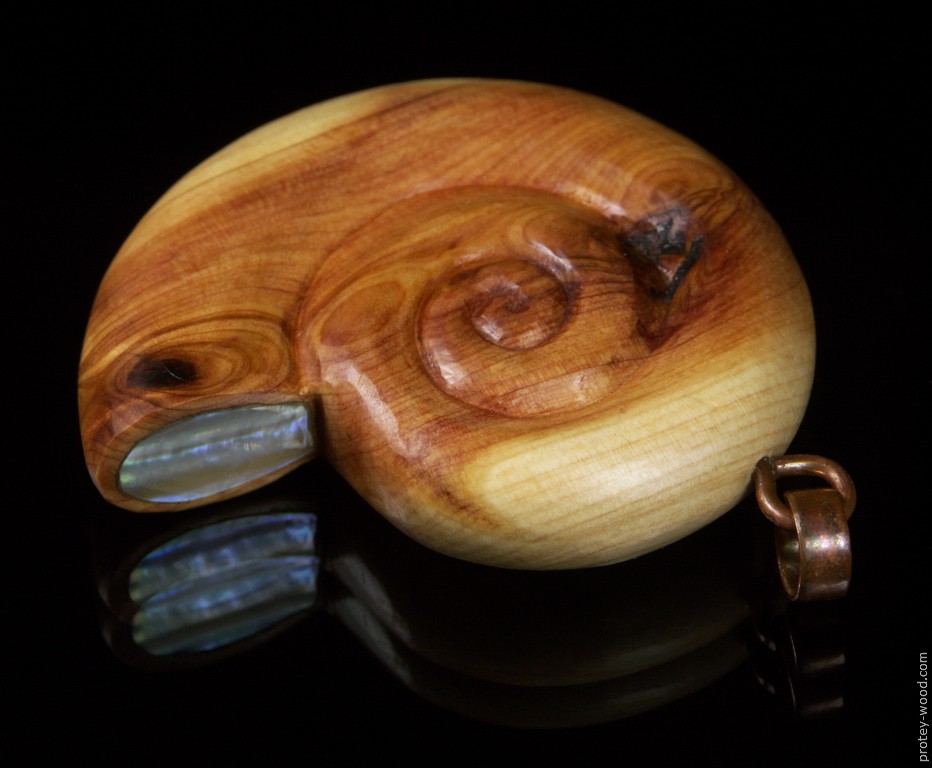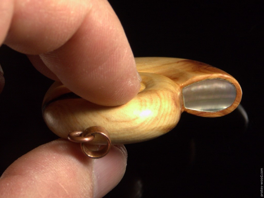 Арча (можжевельник). Инкрустация перламутром. Подвес – оксидированная медь Покрытие – пчелиный воск. Размеры 43 х 37 х 10 мм.