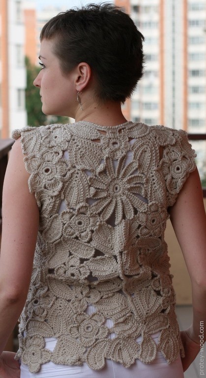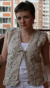 Жилет связан крючком в технике сцепного гипюрного кружева. Пряжа – 50% шерсть, 50% акрил. Размер 46-48.