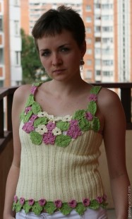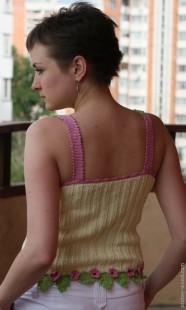 Топ связан спицами и крючком. Спинка и низ лифа связаны спицами. Кокетка и низ топа – крючком в технике сцепного гипюрного кружева.