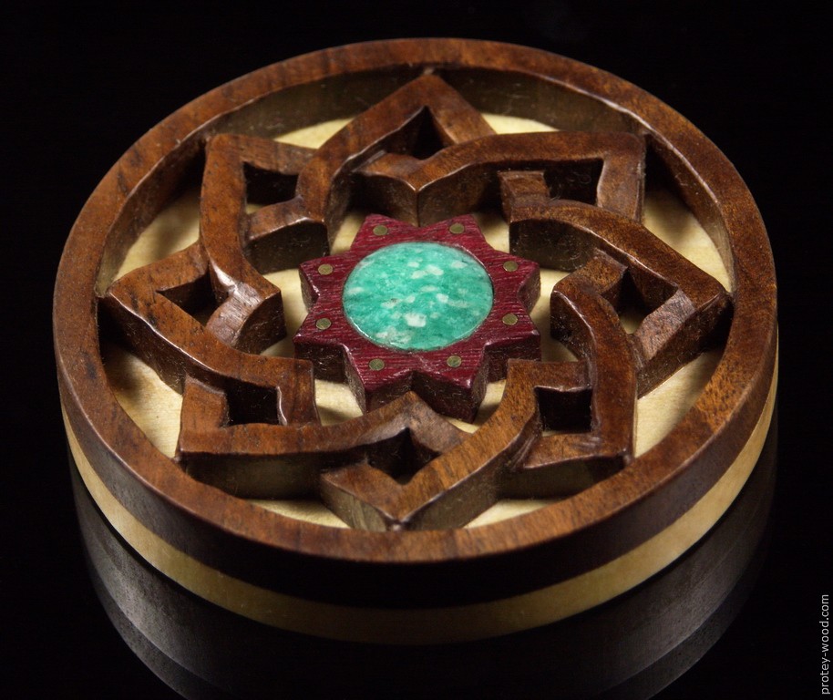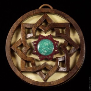 Вставка – амазонит. Точечная инкрустация – латунь. Подвес – медь.