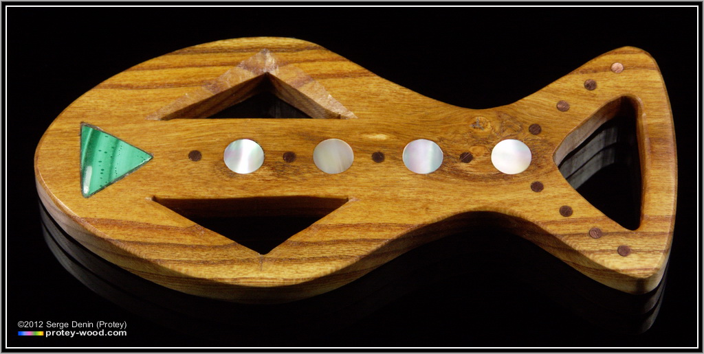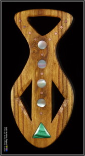 Основа – миндаль обыкновенный. Инкрустация – перламутр, медь. Вставка – малахит. Покрытие – масляный состав «Teak oil». Размеры (высота х ширина) – 65 х 30 мм. На тыльной стороне кулона выбито клеймо мастера – «D».