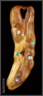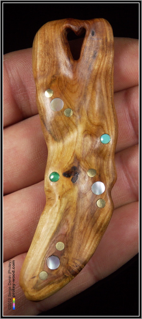 Древесина миндаля колючейшего. Инкрустация – перламутр, латунь, натуральная бирюза и малахит. Покрытие – карнаубский воск. Размеры (высота х ширина) – 85 х 25 мм. На тыльной стороне кулона выбито клеймо мастера – «D».