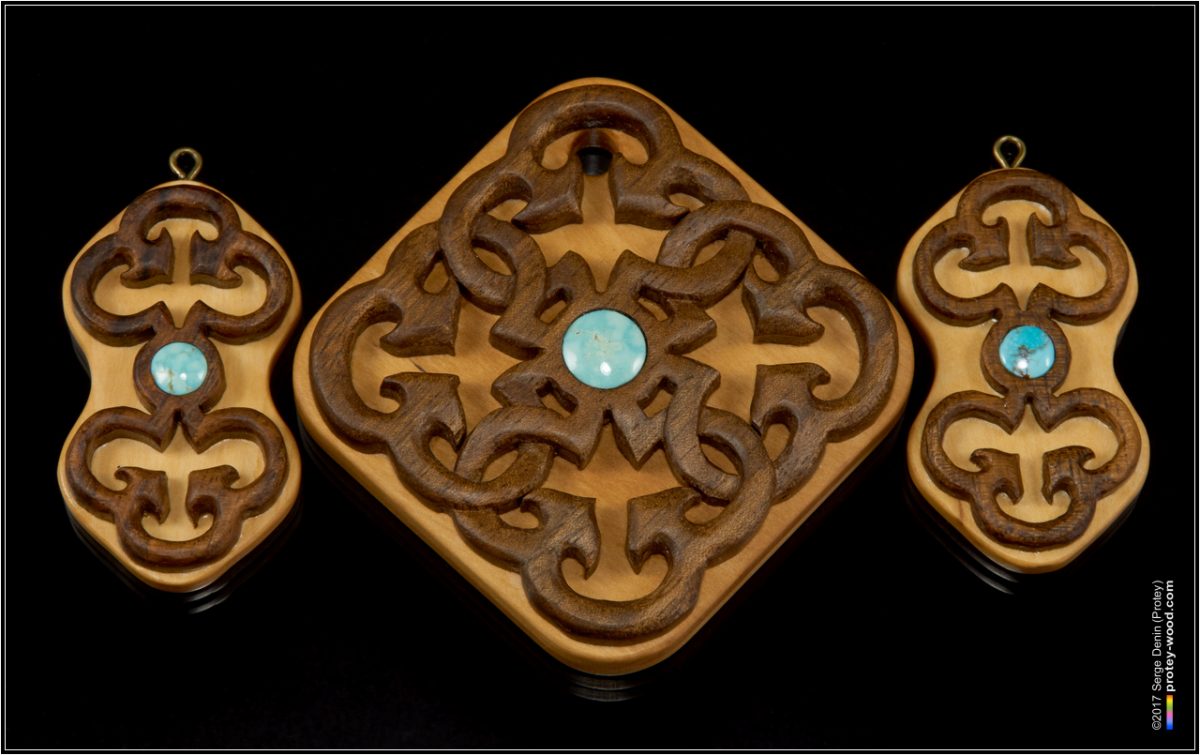 Основа – боярышник. Резные накладки – орех. Вставки – натуральная бирюза. (Серьги изображены без швенз). Покрытие – масляный состав «Teak oil». Размеры: кулон – 65 мм, серьги – 50 мм.
